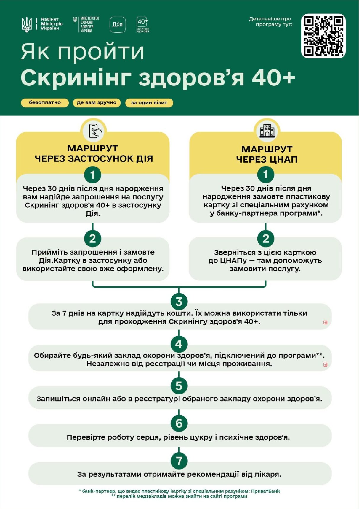 Що робити, якщо ви хочете пройти Скринінг здоров’я 40+, але не користуєтесь Дією? Тоді для вас алгоритм участі в скринінгу здоров’я 40+ дещо інший. Достатньо через 30 днів після дня народження замовити пластикову карту зі спеціальним рахунком у визначених банках (наразі – ПриватБанк) та звернутися до найближчого ЦНАПу. Там вам допоможуть подати заявку, підтвердити особу та вказати спеціальний рахунок у банку. На нього протягом 7 днів буде зараховано 2000 гривень для оплати скринінгу. Далі все працюватиме так само, як і для користувачів Дії: обираєте медзаклад із затвердженого переліку і проходите комплексне обстеження.